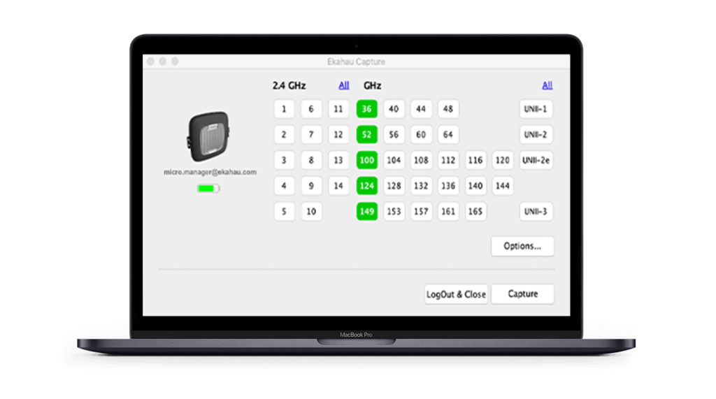 Tận dụng cả 4 bộ thu phát Wi-Fi trong Ekahau Sidekick 2 để thu thập đồng thời trên 4 kênh Wi-Fi trên thiết bị iOS của bạn. Đảm bảo không bỏ sót gói dữ liệu nào khi thiết bị chuyển vùng giữa hai điểm truy cập bằng cách thu thập trên tất cả các băng tần.