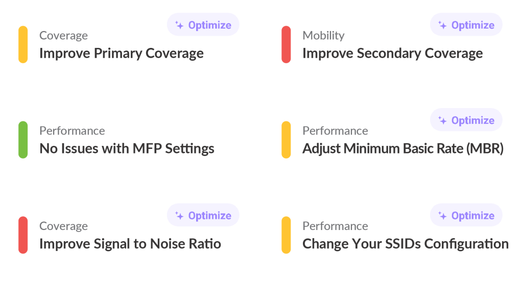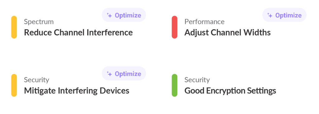 Nhận các giải pháp tối ưu hóa mạnh mẽ được cá nhân hóa cho mạng lưới độc đáo của bạn, đến từng cài đặt radio riêng lẻ tại mỗi điểm truy cập. Bạn có thể xem kế hoạch hành động tối ưu hóa trên trình duyệt hoặc xuất sang PDF để chia sẻ với đồng nghiệp hoặc khách hàng.